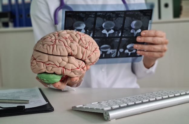 Doutor examia o raio X cérebro humano