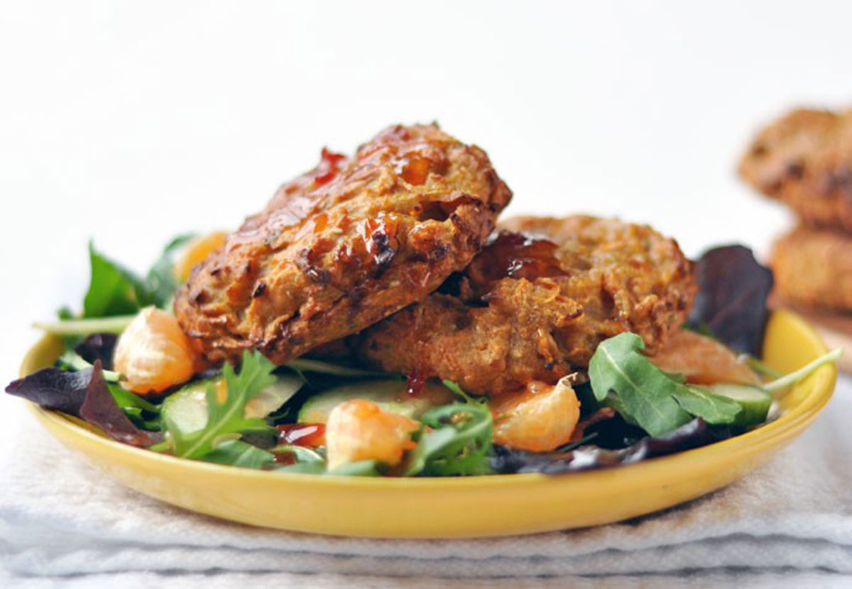 - Em uma tigela, misturar bem a batata doce, o atum (escorrido), a cebola ralada, o sal (pouco), o ovo batido, a cebolinha e a farinha de aveia.