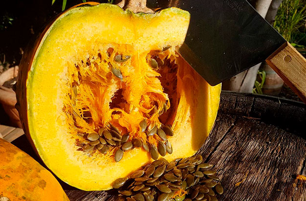 - Depois, separe as sementes da polpa da abóbora, lave-as bem e deixe secar;