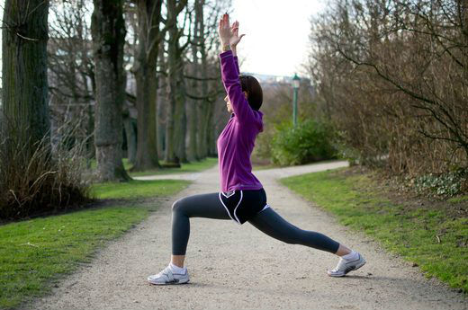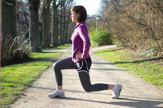 Permanecer na posição por alguns segundos e esforçar-se para endireitar a perna de trás até sentir um alongamento na frente da coxa esquerda. Levantar-se, voltar à posição original e repetir o mesmo movimento, trocando os posicionamentos das pernas.