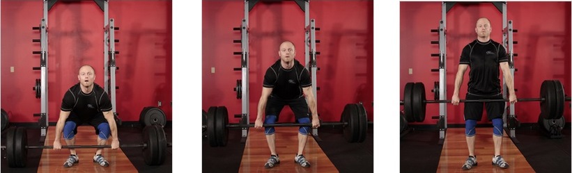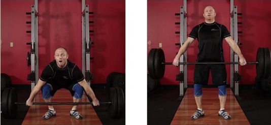 Como fazer: posicionar-se em pé, segurando uma barra de pesos próxima às canelas. Os pés devem estar diretamente abaixo dos quadris e ligeiramente voltados para fora. Agarrar a barra com uma pegada em gancho (em que o dedão fica preso pelo dedo indicador e pelo médio) ou pronada (double overhand grip, com as palmas das mãos voltadas para baixo) e as mãos separadas em uma distância equivalente à largura dos ombros.