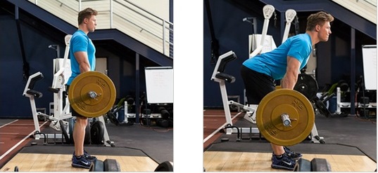 Como fazer: em pé, segurar uma barra de pesos na altura dos quadris. A pegada deve ser com as palmas das mãos voltadas para baixo, os ombros devem estar para trás, as costas arqueadas e os joelhos ligeiramente dobrados.