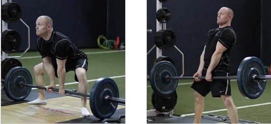 Iniciar o movimento de levantar a barra, conduzindo por meios dos calcanhares, elevando os quadris. O ângulo das costas deve ser o mesmo até a hora em que a barra ultrapassar os joelhos. Ao chegar nesse ponto, conduzir os quadris por meio da barra enquanto se recosta.