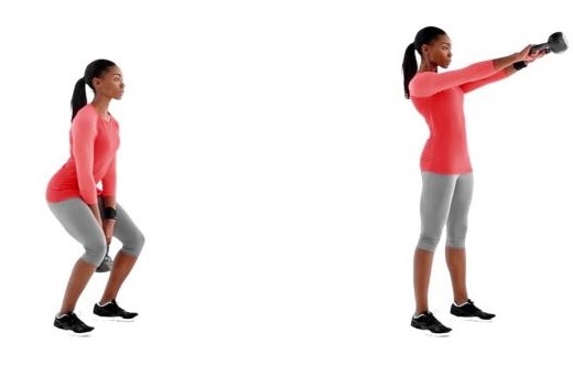 Então, deixar o peso cair e passá-lo por entre as pernas, mantendo os braços totalmente estendidos. Após isso, empurrar os quadris para frente de forma explosiva, contraindo os glúteos. O impulso deve ser mecânico. Elevar o kettlebell até a altura dos ombros sem usar a força dos músculos do braço para fazer o movimento. Descer o peso e deixar o kettlebell balançar novamente para baixo, voltando à posição inicial.