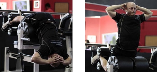 Então, começando a partir da parte baixa do movimento, manter as costas arqueadas enquanto começa o exercício, flexionando os joelhos. Conduzir os dedos dos pés até a estrutura para os pés enquanto sobe a parte superior do corpo, que deve ser mantida reta. Continuar o movimento até que o corpo se encontre na posição ereta.