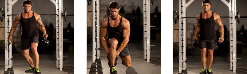 O passo seguinte consiste em passar o kettlebell entre a perna da frente, entregando o peso de uma mão para a outra enquanto faz o avanço. Empurrar através o calcanhar do pé e voltar à posição inicial.