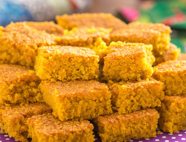 Misture bem. Distribua a massa em assadeira forrada com papel manteiga e untada e asse em forno médio por 30 minutos. Retire, espere amornar e sirva com a cobertura.