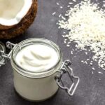 Em uma panela, misture o leite de coco, a água e o agar e leve para aquecer em fogo baixo por 3 minutos. Desligue, espere amornar à temperatura de 45 graus (utilize termômetro culinário). Misture o óleo de coco, o açúcar e por último o probiótico. Despeje em um vidro esterilizado e envolva numa bolsa térmica ou em panos num ambiente mais aquecido como dentro do forno. Deixe fermentar de 8 a 12 horas, e leve à geladeira. Se desejar, adicione coco ralado. Também pode ser feito sem adoçar, se preferir. Deve ser consumido em 5 dias.