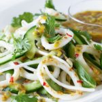 Prepare a marinada: esprema o suco de um limão siciliano em uma tigela, coloque a mostarda, uma pitada de sal e meia colher de mel. Adicione azeite de oliva a gosto e bata aos poucos até emulsificar. Coloque a lula para marinar e deixe um tempo descansando na geladeira. Sirva em seguida com salsinha fresca.