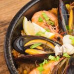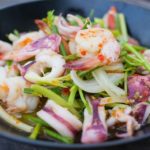 Comece o preparo pela lula: ferva um litro de água com uma colher de sal e coloque os aneis de lula aos poucos. Cozinhe por um minuto e retire da água, levando diretamente para um recipiente com água fria e gelo. Reserve.