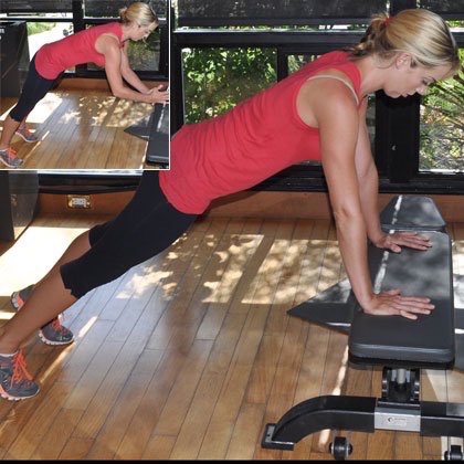 Colocar as duas mãos na escada e ficar na posição de flexão, com os pulsos diretamente abaixo dos ombros e os pés separados em uma distância equivalente à largura dos quadris. Acionar as pernas e o core enquanto dobra os cotovelos e abaixa o peito em direção ao degrau.