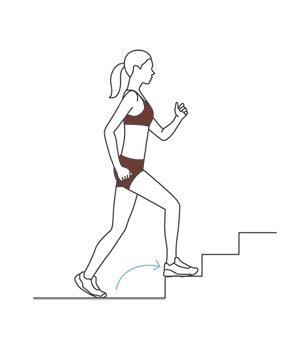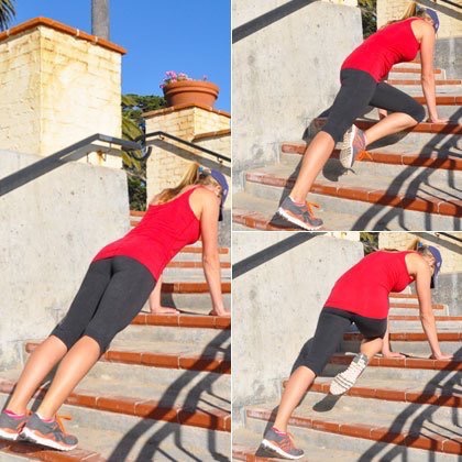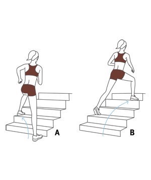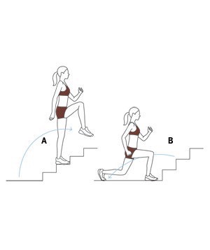 Ficar de frente às escadas com o pé esquerdo no segundo degrau e perna direita atrás de você, no chão. Levantar o joelho direito em direção ao peito e rapidamente dar um passo de volta para retornar ao posicionamento original.