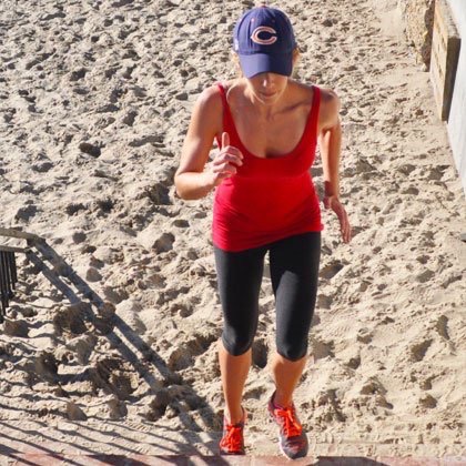 Subir as escadas lentamente, mantendo os ombros para trás e olhando sempre para a frente. Então, descer e repetir o movimento mais três vezes. Depois, subir as escadas correndo e descer andando. Na descida, colocar a maior parte do peso nos calcanhares para que os glúteos absorvam o impacto. Repetir o movimento outras três vezes.