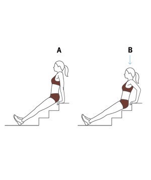 Sentar-se na beira do segundo ou do terceiro degrau da escada com os braços ao lado do corpo. Pressionando para baixo com as palmas das mãos, erguer um pouco as nádegas do degrau. Estender as pernas, descansando os calcanhares no chão. Para quem tem problemas nas costas, a dica é deixar os pés retos no chão e dobras as pernas em um ângulo de 90º.