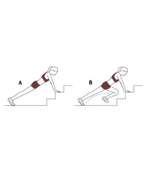 Colocar as duas mãos na escada e ficar na posição de prancha, com os pulsos diretamente abaixo dos ombros e os pés separadas em uma distância correspondente à largura dos quadris, como mostra a imagem acima. Acionar o core para levar o joelho direito em direção ao cotovelo esquerdo.