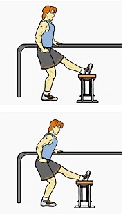 Como fazer: posicionar-se em pé em frente a um banco a ao lado de um móvel ou estrutura onde possa se apoiar. Com uma das mãos na cintura e a outra na estrutura de apoio, colocar um dos pés em cima do banco, dobrando ligeiramente o joelho da perna de apoio.