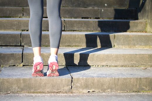 Como fazer: ficar de pé em cima de uma escada, apenas com a parte que fica logo abaixo dos dedos no degrau e com os calcanhares suspensos. Se precisar, segurar-se no corrimão da escada para ter equilíbrio.
