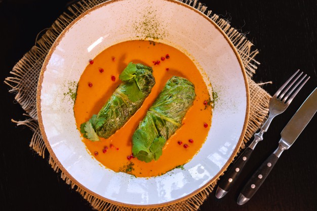 - Depois, coloque um pouco de recheio sobre cada metade das folhas de couve e enrole-as como um charuto;