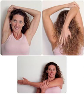 - Eleve os braços na lateral da cabeça e segure-o na região do cotovelo. Repita o exercício do outro lado. Cruze a frente do tórax com um dos braços e pressione o cotovelo junto ao peito. Repita do outro lado. Faça uma rotação simultânea nos dois ombros nos dois sentidos;