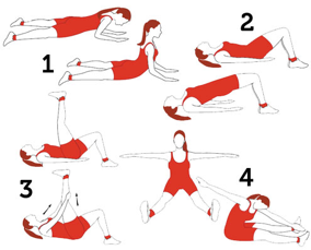 - Deitada de bruços, dobre os cotovelos e apoie as mãos no chão. inspire e eleve o tronco, flexionando a lombar. Deixe as pernas esticadas. Fique na posição por 15 segundos. Faça três séries de cinco repetições;