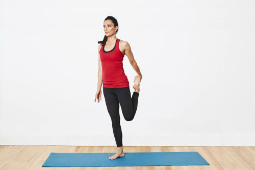Ficar em pé na posição reta e puxar os músculos abdominais. Tentar manter um joelho perto do outro e relaxar os ombros. Enquanto tenta segurar a perna na posição dobrada, irá sentir uma leve puxada ao longo da frente da coxa e do quadril.