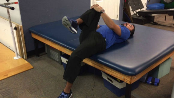 Como fazer: deitar de costas na ponta cama – onde ela esteja mais firme – certificando-se de que o cóccix esteja na beira da cama. Agarrar uma coxa e puxá-la em direção ao peito. Assegurar que as costas estejam retas e não arqueadas. Deixar a gravidade puxar na perna que estiver suspensa.