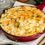 Coloque o recheio todo em um refratário e cubra com o purê de couve-flor. Adicione o queijo ralado e leve para gratinar no forno. Sirva!