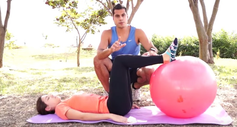 Conforme a gravação selecionada mostra, você deve deitar-se com as costas em uma esteira ou colchonete e colocar toda a parte de trás dos seus pés em cima de uma bola de pilates. Depois disso, é preciso erguer o corpo, desde a região das pernas até o tronco, formando uma espécie de ponte.