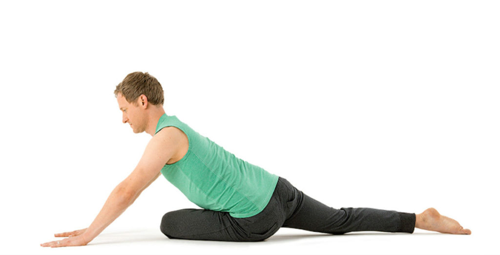 Respirar fundo e, enquanto exala, inclinar a parte superior do corpo para a frente sobre a perna da frente. Suportar o peso do corpo com os braços o máximo que conseguir. Repetir o exercício trocando as posições das pernas.