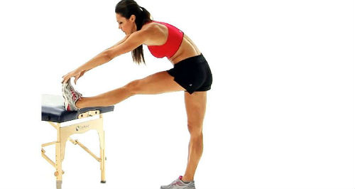 Como fazer: colocar o pé direito em uma superfície elevada e bem segura, como uma cadeira, degrau ou caixote, que deve estar abaixou ou no nível dos quadris. Flexionar o pé, de modo que os dedos dos pés e as pernas fiquem retos. Se o seu joelho tende a hiperestender, mantenha-o ligeiramente dobrado.