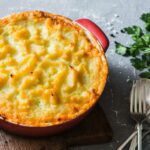 Montagem: adicione todo o recheio em um pirex e por cima coloque o purê. Se preferir faça em ramequins individuais. Coloque queijo por coma e gratine no forno. Sirva!