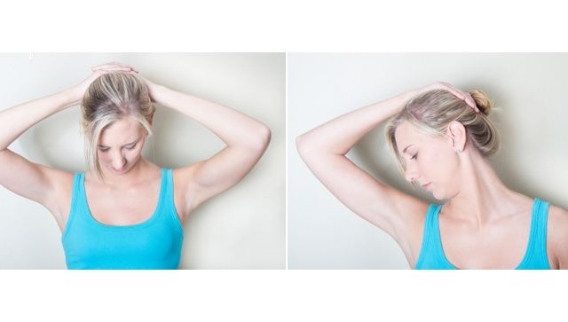 Para fazê-lo, é preciso colocar as duas mãos atrás da cabeça, flexionando os cotovelos, como na primeira imagem. O próximo passo é levar a cabeça para frente e depois para trás.