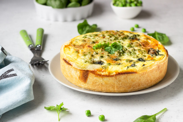 - Coloque sobre a massa da quiche as fatias de abobrinha (finas) e de pimentão, despejando a mistura de ovo por cima;