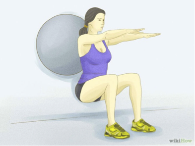 Você ainda pode fazer o agachamento com a ajuda de uma bola própria para exercícios. Com as suas costas, pressione-a contra a parede e realize a descida, com os braços e pernas distanciados um dos outros, como pode ser observado na imagem abaixo: