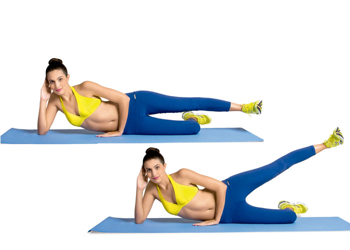 Uma das opções é deitar de lado e fazer movimentos de subida e descida com a perna que está por cima durante 30 segundos e depois mudar a posição, passando a executar os mesmo movimentos com a outra perna.