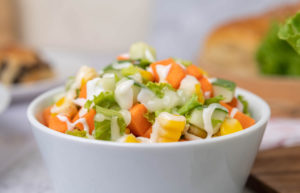 - Tampar a salada com plástico filme por 15 minutos para soltar o vapor e ajudar a cebola a perder o amargor. Está pronto pra servir.