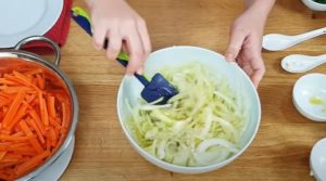 - Em outro recipiente, cortar a cenoura em fatias longas e finas (à juliana) e cozinhá-la no vapor. Juntar a cenoura com a cebola temperada, acrescentando por fim a salsinha.