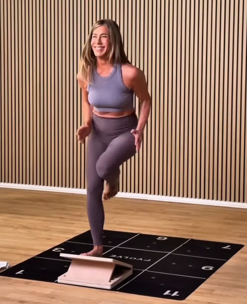 Não para por aí: Aniston pratica aulas de escalada em seu simulador de escadas e reserva alguns instantes de sua rotina diária para meditar.