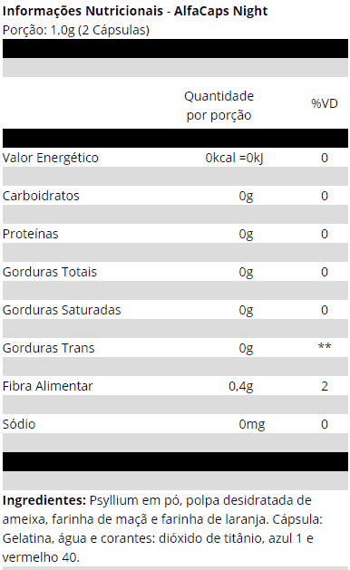 Pois bem, Alfa Caps Night é um suplemento que promete controlar o apetite, diminuir o inchaço, reduzir a ansiedade, diminuir a absorção de gorduras e contribuir com a eliminação de gorduras por parte do corpo. A composição do produto conta com psyllium em pó, polpa desidratada de ameixa, farinha de maçã e farinha de laranja.