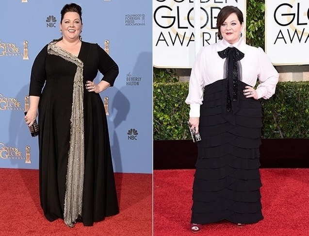 A diferença entre as fotografias da atriz Melissa McCarthy nos eventos da premiação do Globo de Ouro de 2014 e 2015 é nítida. E não é para menos: foram aproximadamente 20 kg eliminados entre um evento e outro.