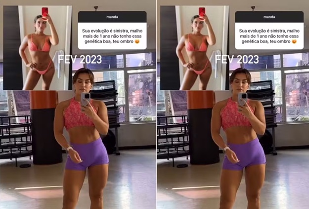 A youtuber postou uma foto de fevereiro de 2023 ao lado de outra com sua aparência atual. “Sua evolução é sinistra. Malho há mais de um ano, não tenho essa genética boa, teu ombro”, analisou um seguidor. Kéfera concordou: “Olha essa minha foto que eu estou assim, de boa, fevereiro do ano passado. E agora. Muito forte, né?”.