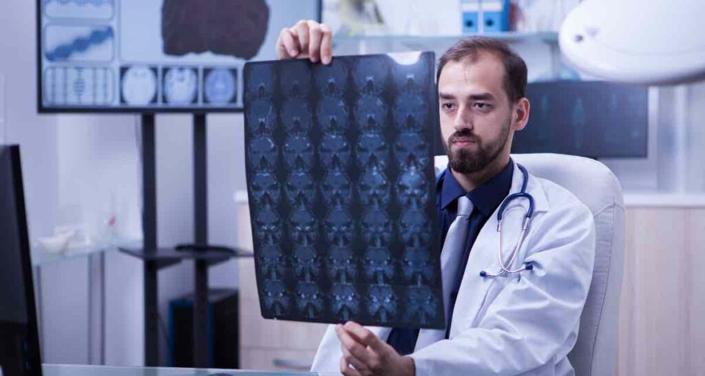Doutor examia o raio X cérebro humano