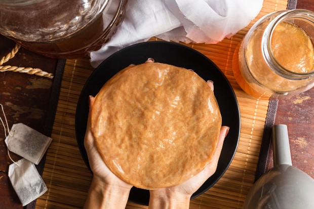 O kombucha é feito ao adicionar uma colônia de bactérias e leveduras vivas, o SCOBY, sigla para Symbiotic Culture Of Bacteria and Yeast, que em português significa colônia simbiótica de bactérias e leveduras, numa bebida adoçada.