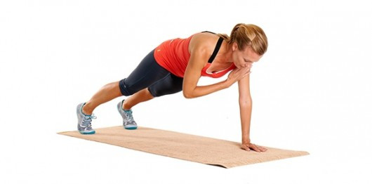 Como fazer: a posição inicial é a da prancha alta normal – de barriga para baixo, com os pés juntos, os braços e pernas estendidos, todo o corpo erguido do chão e apenas as pontas dos pés e as palmas das mãos apoiadas no solo. As palmas devem ficar retas no chão e os ombros devem ficar empilhados diretamente acima dos pulsos.