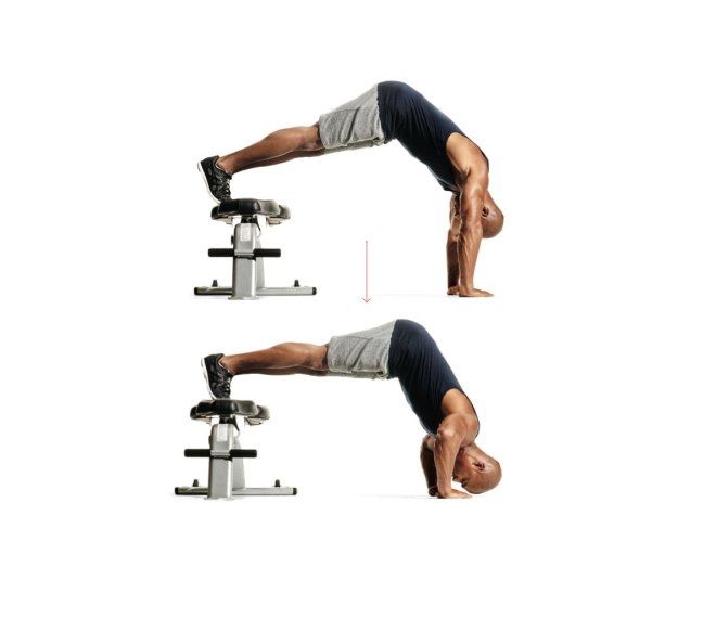 Como fazer: trata-se de uma variação do exercício anterior de como treinar ombros em casa, só que é feita com os pés elevados. Portanto, a posição inicial é a mesma da flexão pike, apenas com a diferença dos pés serem posicionados em cima de uma superfície elevada como um banco, caixa ou degrau de escada.