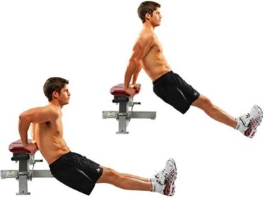 Feito isso, dobrar os cotovelos e descer o bumbum abaixo do banco. Continuar a dobrar os cotovelos até que eles formem um ângulo de 90º. Então, endireitar os braços para subir de volta ao posicionamento original.