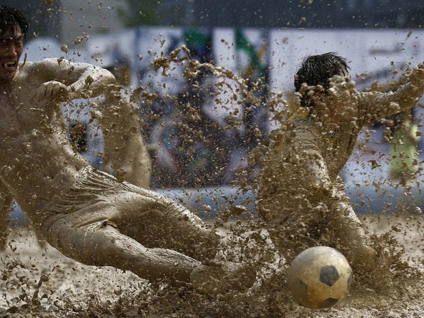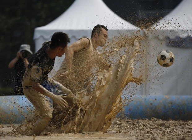 Já em sua quarta edição, a China promove o campeonato mundial de futebol na lama.