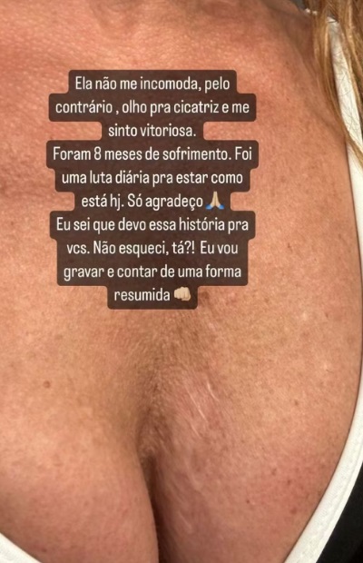 “Ela (a cicatriz) não me incomoda, pelo contrário. Olho para a cicatriz e me sinto vitoriosa. Foram oito meses de sofrimento. Foi uma luta diária para estar como está hoje. Só agradeço”, declarou.