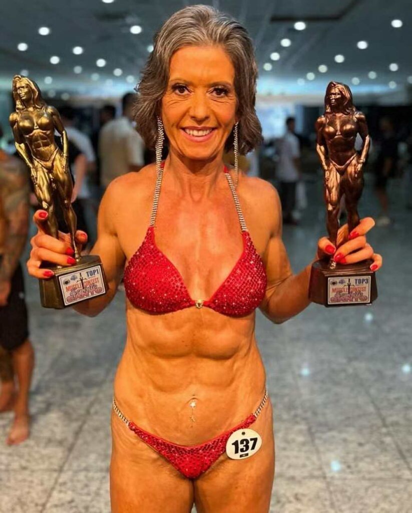 A atleta participou do Musclecontest Brazil em 2023 e levou dois troféus, na categoria Bikini Master e em Wellness Master. “Para mim, era algo inalcançável. Nunca pensei nisso, especialmente por causa da minha idade. Tinha esse bloqueio, essa ideia de que uma mulher de 60 anos não subiria em um palco de fisiculturismo”, confessa.