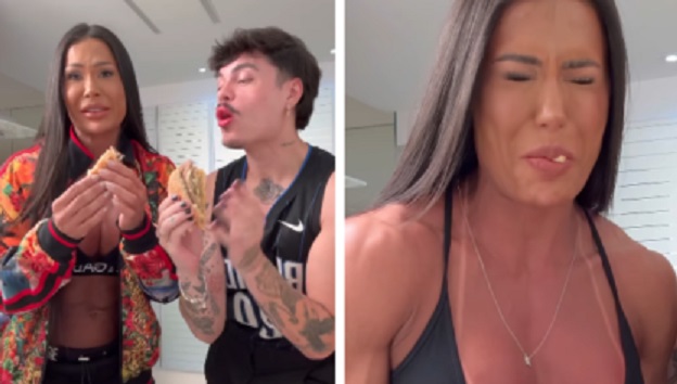 A musa fitness foi desafiada a comer hambúrguer e batata frita ao participar de um vídeo do canal do influencer Bomtalvão, 28 anos. Barbosa, no entanto, não parece ter curtido muito a experiência. “Não gostei! É muito salgado!”, reclamou ela.